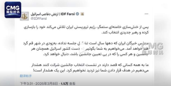 据CCTV外洋时讯,以色各国防军今天(3月8日)称,伊朗正试图重组军队并选出一位新换取东说念主,四十年来未始召开的伊朗大师会议瞻望很快将在库姆市召开。以色列将连接精致哈梅内伊继任者和任何试图任命他的东说念主的背负;并警告统共经营插足选举的东说念主:以色列也会绝不逗留地将其看成指标。